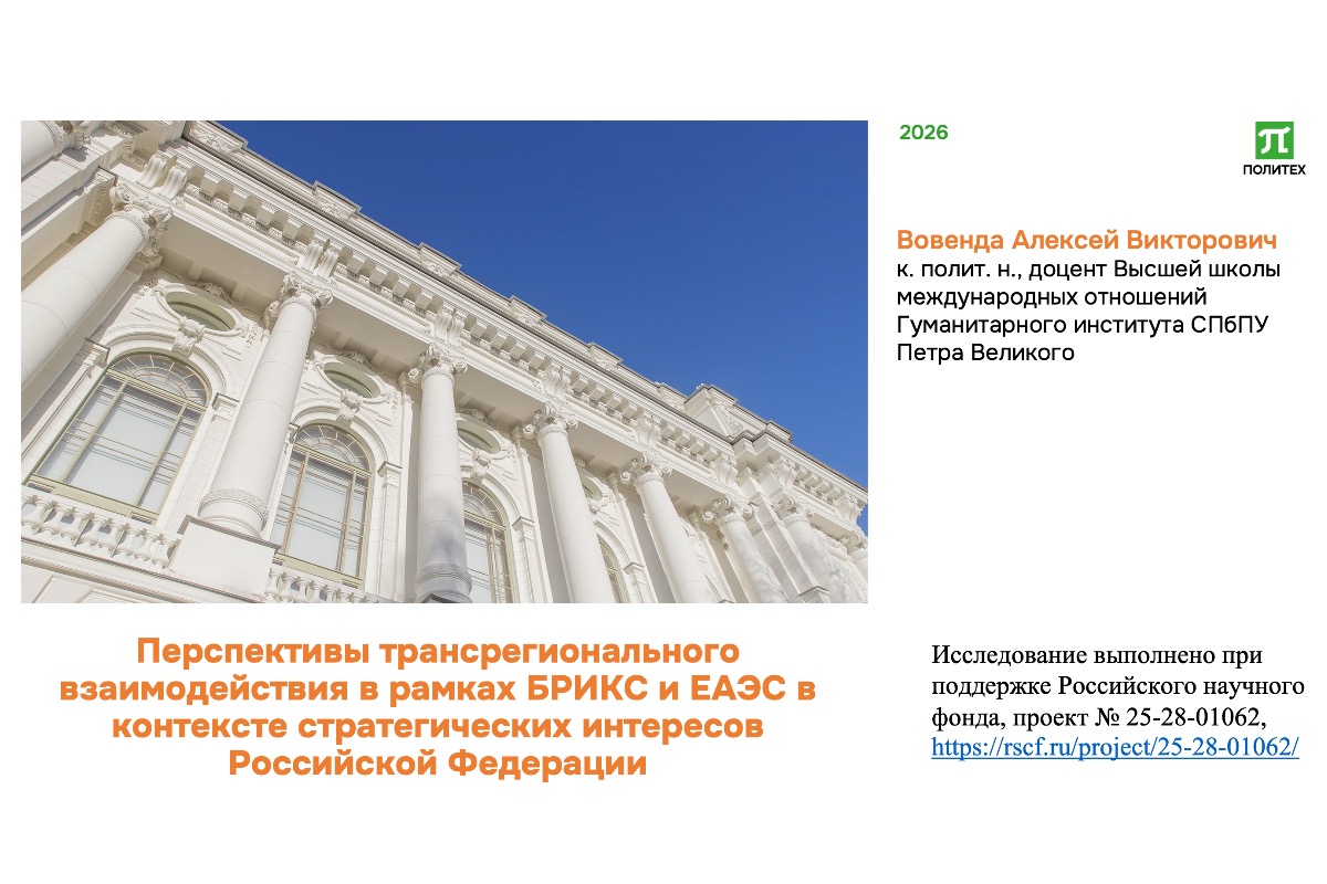 Вовенда Алексей Викторович, к.полит.н., доцент ВШМО ГИ представил доклад на тему «Перспективы трансрегионального взаимодействия в рамках БРИКС и ЕАЭС в контексте стратегических интересов Российской Федерации». В докладе раскрыт феномен трансрегионализма, механизмы которого в комплексе отражают современные процессы трансформации и перспективы развития БРИКС. В настоящее время активно развивающиеся форматы межрегиональных связей становятся важным элементом и стратегии развития ЕАЭС. Развитие подобных форматов взаимодействия и расширения сети стран-партнеров входят в стратегические интересы Российской Федерации.