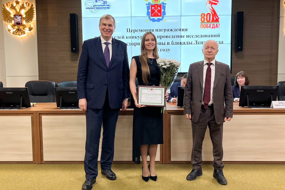 18 декабря 2025 года в Административно-деловом квартале «Невская ратуша» состоялась торжественная церемония награждения победителей конкурса на проведение исследований по изучению истории обороны и блокады Ленинграда в 2025 году. В число победителей в этом году вошли 7 студентов, аспирантов и сотрудников Политеха. В числе победителей — Мушенко Екатерина Владимировна, старший преподаватель ВШМО и Крисон Полина, студентка 3 курса ВШМО (группа 3 834 101/30302).