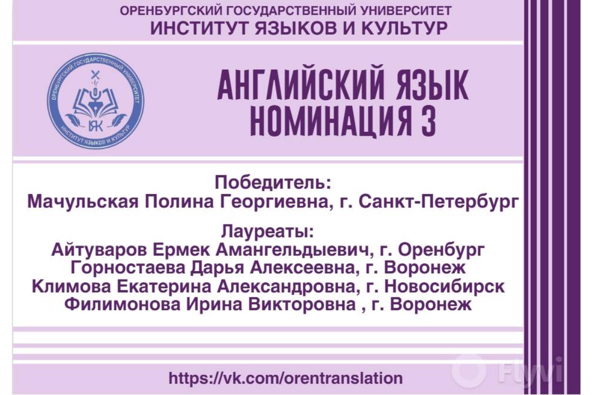 Мачульская Полина (студентка 4 курса, группа 3834101/20304) заняла 1 место, а также стала лауреатом в Конкурсе переводов ORENtranslation в номинациях «Перевод с английского языка на русский научно-популярного текста» и «Перевод с китайского языка на русский художественного текста» (Оренбургский государственный университет институт языков и культур).