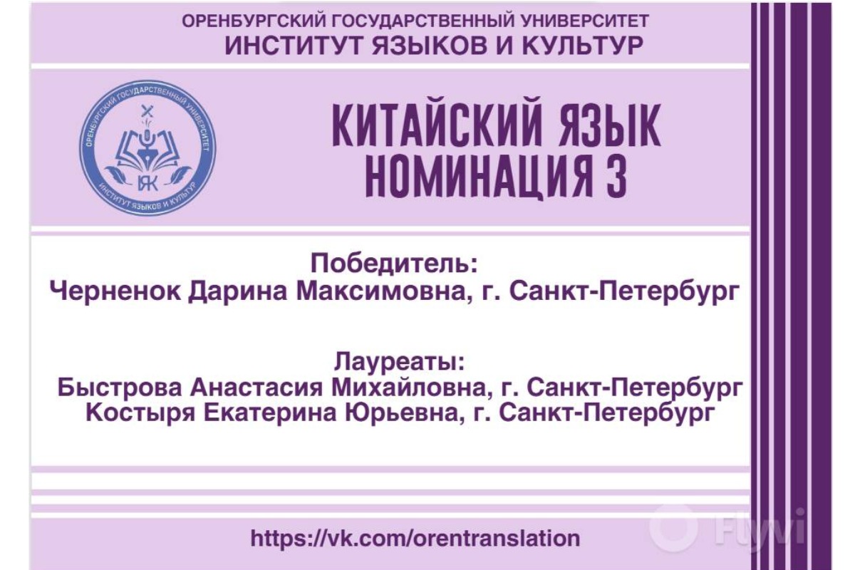 Черненок Дарина (студентка 4 курса, группа 3834101/20304) заняла 1 место, а также стала лауреатом в Конкурсе переводов ORENtranslation в номинациях «Перевод с китайского языка на русский научно-популярного текста» и «Перевод с английского языка на русский научно-популярного текста» (Оренбургский государственный университет институт языков и культур).