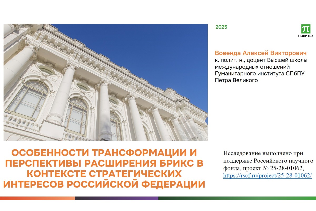 Доцент Вышей школы международных отношений, к.полит.н. Вовенда Алексей Викторович выступил с докладом на пленарной сессии на тему «Особенности трансформации и перспективы расширения БРИКС в контексте стратегических интересов Российской Федерации». В докладе была представлена характеристика основным теоретическим подходам к анализу процесса трансформации группы БРИКС с позиций «нового» регионализма и проблематики развития стран Глобального Юга через призму теории зависимости Р. Пребиша. Особое внимание было уделено перспективам расширения БРИКС, новым институциональным и инфраструктурным измерениям работы Нового банка развития БРИКС, а также потенциалу БРИКС в качестве платформы для взаимодействия с другими интеграционными группами и трансрегиональными формами взаимодействия государств. Доклад вызвал интерес у участников мероприятия и завершился активной дискуссией. Широкий географический охват участников подчеркнул международный статус и значимость конференции.